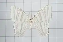 It is a white moth with black fasciations. Black dots are found on the tail margins of the hindwings.[5]