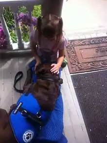 Like all assistance dogs, a psychiatric assistance dog is individually trained to do work or perform tasks that mitigate their handler's disability.[4] Training to mitigate a psychiatric disability may include providing environmental assessment (in such cases as paranoia or hallucinations), signaling behaviors (such as interrupting repetitive or injurious behaviors), reminding the handler to take medication, retrieving objects, guiding the handler from stressful situations, or acting as a brace if the handler becomes dizzy. Moreover, the dog can be an extremely useful companion in any controlled training concerning cognitive functions, such as walking the dog.[5][4]