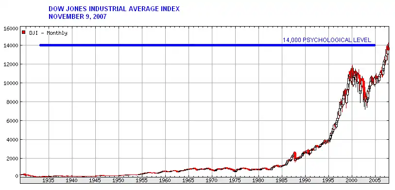 1. Dow Jones Industrial Average Index - $14,000.00 - the all-time high psychological thousandth level as of 11/9/2007. Also known as "Dow 14,000"