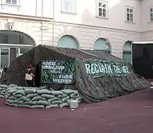 The Free Media Camp aimed at raising public awareness about the extremely precarious situation of independent and participatory media initiatives in Vienna. The camp was established in public space at Vienna Karlsplatz and lasted for almost four months. In sum approximately 100 events (discussions, presentations, music events, screenings...) took place. The camp was organized by Public Netbase in co-operation with local cultural and media initiatives: Malmoe, IG Kultur Wien, Radio Orange 94.0 and Public Voice Lab.[43][44]