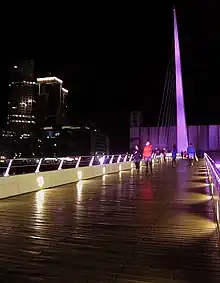 The Puente de la Mujer (Spanish for "Woman's Bridge") is a rotating footbridge for Dock 3 of the Puerto Madero commercial district of Buenos Aires, Argentina. It is of the cantilever spar cable-stayed bridge type and is also a swing bridge, but somewhat unusual in its asymmetrical arrangement. It has a single mast with cables suspending a portion of the bridge which rotates 90 degrees in order to allow water traffic to pass. When it swings to allow watercraft passage, the far end comes to a resting point on a stabilizing pylon.