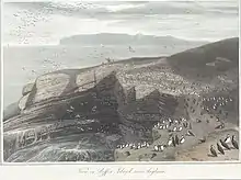 The island is a Special Protection Area[6] (SPA), particularly because of its great cormorant colony of over 750 birds, which is over 10% of the national population, making it one of the largest colonies in the British Isles.[7] It also has good numbers of guillemot, razorbill, shag and kittiwake nesting,[8] and in recent years small numbers of common eider and black guillemot.[9] The Atlantic puffins from which the island gets its modern English name bred in considerable numbers at one time, with up to 2000 pairs recorded.[10] The brown rat was introduced accidentally to the island, probably in the late 19th century, and reduced this population to a very few pairs. A programme of poisoning these rats started in 1998 by the Countryside Council for Wales appears to have eradicated them, and the puffin population has shown an increase since that date.[11]
