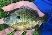 The pumpkinseed x bluegill sunfish[1] (Lepomis gibbosus x macrochirus), sometimes referred to as hybrid sunfish or pumpkingill, is a hybrid between a pumpkinseed (Lepomis gibbosus) and a bluegill (Lepomis macrochirus).[2] They are sometimes found in lakes and ponds where both parent species are present.[2]