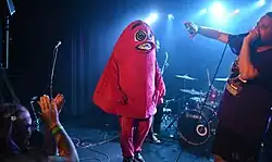 ![]() Purple City mascot Nurple joins the hardcore band Vibes on stage at Temple, 25 August 2023. | |