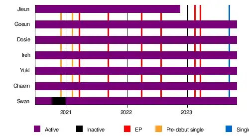 ![]() Purple Kiss in October 2021 L–R: Ireh, Yuki, Chaein, Na Go-eun, Dosie, Swan and Park Ji-eun (former) | |