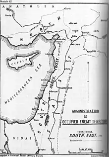 Lieutenant General E. S. Bulfin, commander of the XXI Corps, established his headquarters in the city's main hotel, to oversea devolution of the city's administration to the French following the terms of the Sykes–Picot Agreement. He appointed Colonel de Piépape, commander of the infantry Détachment Français de Palestine et de Syrie, military governor at Beirut. He also appointed French military governors to Sidon and Tyre. When detachments of French troops arrived from Haifa by sea to garrison the three towns, they found some unrest caused by disappointed Arab Sherifial representatives.[16][25] The infantry Détachment Français de Palestine et de Syrie arrived at Beirut on 20 October, and the cavalry Regiment Mixte de Marche de Palestine et Syrie, detached from the 5th Light Horse Brigade, arrived on 24 October. The 54th (East Anglian) Division arrived at Beirut on 31 October 1918.[26]