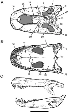 The skeletal anatomy of P. mirandai shows some adaptations for more upright limb orientation or weight support. Unlike all other members of the crown Crocodylia, which have two sacrals, P. mirandai have three.[5]
