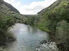 Putah Creek (Patwin: Liwaito[3]) is a major stream in Northern California, a tributary of the Yolo Bypass, and ultimately, the Sacramento River. The 85-mile-long (137 km)[2] creek has its headwaters in the Mayacamas Mountains, a part of the Coast Range, and flows east through two dams. First, Monticello Dam forms Lake Berryessa, below which Putah Creek forms the border of Yolo and Solano Counties, and then flows to the Putah Diversion Dam and Lake Solano. After several drought years in the late 1980s, the majority of Putah Creek went dry, prompting a landmark lawsuit that resulted in the signing of the Putah Creek Accord in 2000. The Accord established releases from the dams to maintain stream flows in Putah Creek, with natural flow regimes which spike in winter/spring and ebb in summer/fall. The restoration of natural flow regimes has resulted in a doubling of riparian bird species and a return of spawning native steelhead trout and Chinook salmon, as well as protecting the livelihood of farmers on the lower watershed.[4][5]