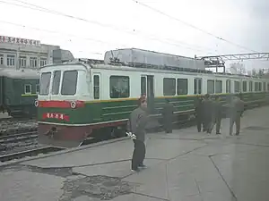 The former Berlin trainsets were given a new red and cream livery in Pyongyang.[45] All advertising was removed and replaced by portraits of leaders, Kim Il Sung and Kim Jong Il. In 2000, a BBC reporter saw "old East German trains complete with their original German graffiti".[10] Koryo Tours in another article write about and show the old West-Berlin D-trains, suggesting that the BBC article could have mixing them up with the Class GI of East Berlin.[45] After about 2006, Type D cars were mainly used. The Class GI rolling stock has been banned from underground tunnel operations due to frequent control stand fires and was withdrawn from Metro service in 2001, and those cars are now operating on the railway network around Pyongyang and northern regions as commuter trains.[46][47] One Type D metro car appears to have been converted into a departmental vehicle, with a subsequently installed second driver's cab at the car's back next to the inter carriage door. The metro car is painted in yellow with red warning trims.[48]