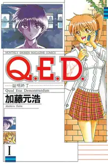 Q.E.D. (Japanese: Q.E.D. 証明終了, Hepburn: Kyūīdī Shōmei Shūryō) is a Japanese manga series written and illustrated by Motohiro Katou. It was serialized in Kodansha's shōnen manga magazines Magazine Great (rebranded Magazine E-no in 2009) and Monthly Shōnen Magazine+ from July 1997 to February 2014, with its chapters collected in 50 tankōbon volumes. The series follow Sou Touma, a university graduate who encounters a variety of investigative cases after returning to Japan from the US. He works with his friend, Kana Mizuhara, combining his deductive skills with Mizuhara's social gifts.