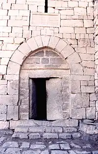 According to Lawrence, "Azrak lay favourably for us, and the old fort would be convenient headquarters if we made it habitable, no matter how severe the winter. So I established myself in its southern gate-tower, and set my six Haurani boys...to cover with brushwood, palm-branches, and clay the ancient split stone rafters, which stood open to the sky." Ali ibn el Hussein "took up his quarters in the south-east corner tower, and made that roof tight." The postern gate was shut each night, "The door was a poised lab of dressed basalt, a foot thick, turning on pivots of itself, socketed into threshold and lintel. It took a great effort to start swinging, and at the end went shut with a clang and crash which made tremble the west wall of the old castle."[3][4]