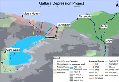 All proposed routes for a tunnel and/or canal route from the Mediterranean Sea towards the Qattara Depression