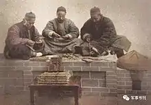The first documented qianzhuang banking institution of Beijing was the Yinhao Huiguan (銀號會館, "bankers' guild hall"), this bank had a shrine called Zhengyisi (正已祠) in its building, the Yinhao Huiguan was first mentioned in 1667 under the reign of the Manchu Qing dynasty. The first qianzhuang in Shanghai was founded seven decades later in 1736 was named the Qianye Gongsuo (錢業公所, "money industry office").[6] The primary business of the qianzhuang was giving out loans in the Chinese hinterland to promote trade and the exchange of commodities with the coastal regions of China.[8] Many qianzhuang engaged in the business exchanging copper-alloy cash coins and silver sycees and foreign coins and vice versa as China used a bimetallic currency system with fluctuating exchange rates.[6] number of coins in a single string was locally determined as in one district a string could consist of 980 cash coins, while in another district this could only be 965 cash coins, these numbers were based on the local salaries of the qiánpù.[10][11] During the Qing dynasty the qiánpù would often search for older and rarer coins to sell these to coin collectors at a higher price.[12][13][14] Remittances by qianzhuang would be carried out using a vast network of partner institutes, the owners of these other financial institutes would often hail from the same region, yet most of these small private banks would only operate locally.[6] Comparatively, the financial landscape of northern China was very much focused on the imperial Chinese government.[8][15][16] The qianzhuang were the main financial institutions serving as intermediaries between the Europeans and the Chinese for financial purposes.