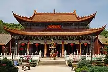 Qiongzhu Temple, or Bamboo Temple (Chinese: 筇竹寺; pinyin: Qióngzhú Sì), is a Buddhist temple situated on Yu'an Mountain (Chinese: 玉案山; pinyin: Yù'àn Shān) to the northwest of Kunming, Yunnan, China. The name of the temple (Qiongzhu) refers to a type of bamboo (genus Qiongzhuea). The Bamboo Temple was established during the Yuan dynasty as the first temple dedicated to Zen Buddhism in Yunnan. It has since been burned down and reconstructed several times. The present structure mostly dates from the late Qing dynasty.