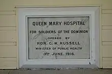 In 1879 the government opened a sanatorium at Hanmer Springs. European settlers had been using the thermal pools since 1859 although Māori had long used them.[3] In 1889 a reserve was created around the pools.[3] The sanatorium building was destroyed by fire in 1914.[3] Duncan Rutherford, a local sheep farmer, offered the use of The Lodge Hotel for convalescent soldiers while a new building was constructed.[3][4][5] In 1915 plans were drawn up for a hospital to accommodate 200 servicemen returning from World War I who needed rehabilitation for mental and nervous conditions, particularly shell-shock.[6][7] The first hospital building was the Soldiers' Block[3] which was opened on 3 June 1916 by G.W. Russell, the Minister of Public Health and Hospitals.[8][9] The full name of the hospital was Queen Mary Hospital for Sick and Wounded Soldiers.[7]