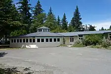 The double-rotunda block was designed by the architects Hoggard, Prouse and Gummer.[3][24] Similar style buildings were built in Featherston, Wellington and Rotorua but the Hanmer building is the only one remaining.[3] It was opened in 1916 and contained two wards each of which had 60 beds.[3] The wards were in the two rotunda at either end of the building which were connected by a long corridor containing single rooms. A large central hall in the middle was for meals, recreation and socialising.[3] The two wards were called Joffre and Kitchener, after General Joffre and Lord Kitchener.[3][9][11] The dining hall was named after the British nurse Edith Cavell.[9][11] In 1917 a verandah was added to the front of the building, paid for by Duncan Rutherford.[3]
