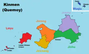 The county consists of the major island of Kinmen along with several surrounding islets, as well as Wuqiu Township remotely located 133 km (83 mi) northeast from the rest of the county.[4] Kinmen is one of two counties that constitutes Fujian Province, the other being Lienchiang County (Matsu).