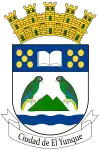 In a silver field, two Puerto Rican parrot (Amazona vitatta), accompanied by a waving blue stripe, a green mountain with three peaks. The top portion of the shield is blue, with an opened silver book, accompanied on each side by five gold coins. Topped by a three tower gold crown outlined in black with green openings.[35]