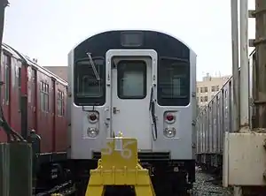 The R110A cars entered service on June 15, 1993, on the 2.[16] Around 1998, they were pulled out of service due to brake problems and fire damage and did not operate in passenger service afterward.[17] They were transported back and forth between IRT line yards and stored until 2013.[16]