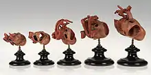 The rabbit's nasal cavity lies dorsal to the oral cavity, and the two compartments are separated by the hard and soft palate.[31] The nasal cavity itself is separated into a left and right side by a cartilage barrier, and it is covered in fine hairs that trap dust before it can enter the respiratory tract.[31][32] As the rabbit breathes, air flows in through the nostrils along the alar folds. From there, the air moves into the nasal cavity, also known as the nasopharynx, down through the trachea, through the larynx, and into the lungs.[32][33] The larynx functions as the rabbit's voice box, which enables it to produce a wide variety of sounds.[32] The trachea is a long tube embedded with cartilaginous rings that prevent the tube from collapsing as air moves in and out of the lungs. The trachea then splits into a left and right bronchus, which meet the lungs at a structure called the hilum. From there, the bronchi split into progressively more narrow and numerous branches. The bronchi branch into bronchioles, into respiratory bronchioles, and ultimately terminate at the alveolar ducts. The branching that is typically found in rabbit lungs is a clear example of monopodial branching, in which smaller branches divide out laterally from a larger central branch.[34]