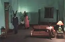 Lynch filmed Rabbits in a set built in the garden of his house in the Hollywood Hills. Filming took place at night in order to control the lighting. Lynch says that filming Watts, Harring and Coffey with the set lit up by enormous lights was "a beautiful thing". However, the process generated a lot of noise that echoed from the surrounding hills and annoyed Lynch's neighbors.[1] The unique use of lighting to create shadows and set an uneasy atmosphere has been praised by critics.