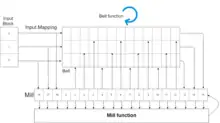 The designers call RadioGatún an "ideal mangling function". RadioGatún uses a "belt" and "mill" to cryptographically process binary data, with the majority of mangling operations performed on the "mill" part of RadioGatún.[9]