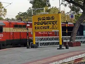 Raichur Junction railway station, also known as Raichuru Junction railway station (station code:RC[1]), is located in Raichur district in the Indian state of Karnataka and serves Raichur and the surrounding industrially efflorescent area. The station has three platforms.