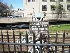 A section of the Chicago-Philadelphia Main Line (now part of Amtrak's Keystone Corridor) was electrified in 1915.[19] The suburban service runs between the former Broad Street Station in Philadelphia and the village of Paoli. The PRR electrification utilized overhead catenary wires electrified at 11 kV 25 Hz, and was fed by four substations in Arsenal, West Philadelphia, Bryn Mawr, and Paoli.[20] It was expanded in 1919 on the PRR's Chestnut Hill line, and in the 1920s on the Philadelphia-Washington, D.C. main line between Philadelphia and Wilmington, and on the West Chester Line between Philadelphia and West Chester, with the latter two lines being fed through a single substation located in Chester.