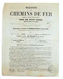 Sardinia, immediately after the Unification of Italy, found itself to be the only territory in the Kingdom without a railway network for public transport: the only lines present were in fact private railways for industrial use. In this regard, the first railway ever to enter into operation on the island was the one between the mine of San Leone and the pier of La Maddalena near Capoterra,[5] a line open to traffic in 1862 . The lack of a public railway network led island politicians several times to request government intervention to grant this service also to Sardinia.