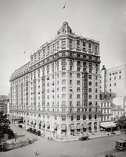 In 1911, the building was razed and rebuilt by architect Henry Janeway Hardenbergh as a 13-story Beaux Arts hotel with a rusticated brick, white limestone, and terra cotta exterior.[2] Congress changed the height limit for buildings on Pennsylvania Avenue NW from 130 feet (40 m) to 160 feet (49 m) in 1910 in order to accommodate the Raleigh Hotel.[2] In 1936, there was a major interior renovation. Curt Schliffeler managed the hotel from 1936 to 1954. In 1964, the Raleigh was demolished.[3]