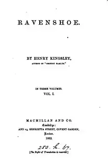 Ravenshoe is a novel by English author Henry Kingsley, published in 1862. It has been noted for the complexity of its three-part plot,[1] and for its description of the Charge of the Light Brigade, a failed military action during the Battle of Balaclava in the Crimean War.[2][3][4]