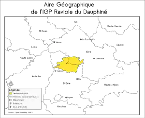 Ravioles du Dauphiné are produced in Romans-sur-Isère and more generally in the region of Royans overlapping the two departments of Drôme and Isère, Auvergne-Rhône-Alpes. Any eggs or creme cheese used in the making of ravioles must also come from this region.[2]