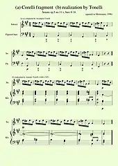 J.S. Bach's pupils were routinely given a single melody line with a figured bass and told to realize a four-part chorale.[106] Or he made them realise figured basses by Italian composers (Ex. 14).[107] Only when they had mastered these exercises were they allowed to compose their own bass lines and harmonies.[106]