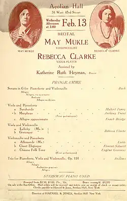 Following her criticism of his extra-marital affairs, Clarke's father turned her out of the house and cut off her funds.[7] She had to leave the Royal College in 1910 and supported herself through her viola playing. Clarke (along with Jessie Grimson) became one of the first female professional orchestral musicians when she was selected by Sir Henry Wood to play in the Queen's Hall Orchestra in 1912.[5][8] In 1916 she moved to the United States to continue her performing career. A short, lyrical piece for viola and piano titled Morpheus, composed under the pseudonym of "Anthony Trent", was premiered at her 1918 joint recital with cellist May Mukle in New York City. Reviewers praised the "Trent", largely ignoring the works credited to Clarke premiered in the same recital.[7] Her compositional career peaked in a brief period, beginning with the viola sonata she entered in a 1919 competition sponsored by Elizabeth Sprague Coolidge, Clarke's neighbour and a patron of the arts.
