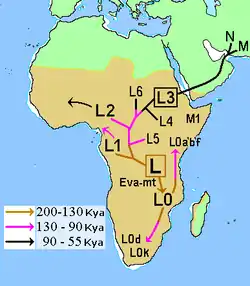 The first lineage to branch off from Mitochondrial Eve was L0. This haplogroup is found in high proportions among the San of Southern Africa and the Sandawe of East Africa. It is also found among the Mbuti people.[94][95] These groups branched off early in human history and have remained relatively genetically isolated since then. Haplogroups L1, L2, and L3 are descendants of L1–L6, and are largely confined to Africa. The macro haplogroups M and N, which are the lineages of the rest of the world outside Africa, descend from L3. L3 is about 70,000 years old, while haplogroups M and N are about 65–55,000 years old.[96][64] The relationship between such gene trees and demographic history is still debated when applied to dispersals.[97]