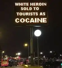 In May 2011, the Dutch government announced that tourists would to be banned from Dutch coffeeshops, starting in the southern provinces at the end of 2011,[3] and the rest of the country by 2012,[4] though this was never made into law and thus coffeeshops throughout the Netherlands continue remain open to tourists as of May 2016.[5] On 25 November 2014 two British tourists aged 20 and 21 died in a hotel room in Amsterdam, after snorting white heroin that was sold as cocaine by a street dealer.[6] The bodies were found less than a month after another British tourist died in similar circumstances. At least 17 other people have had medical treatment after taking the white heroin.[7]