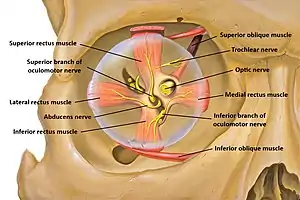 Diagram illustrating the locations of extraocular muscles and ocular cranial nerves. Paresis of the oculomotor nerve (CNIII) reduces the strength of medial rectus, superior rectus, inferior rectus, and inferior oblique muscles, while trochlear nerve (CNIV) and abducens nerve (CNVI) paralysis affect superior oblique muscle and lateral rectus muscle respectively.