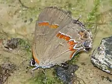 The red-banded hairstreak (Calycopis cecrops) is a butterfly native to the southeastern United States. It feeds on fallen leaves of sumac species and other trees. Its size ranges from 0.9–1.25 inches (23–32 mm). It lives near coastal areas.
