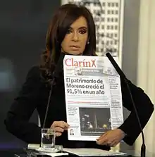 Papel Prensa is the largest Argentine producer of newsprint.[27] The company is owned by the newspapers Clarín and La Nación, with a 27.5% share owned by the Argentine government.[28] President Cristina Fernández de Kirchner alleged that the sale of Papel Prensa by the family of the late David Graiver in 1976 was done so by illicit means and in collusion with the dictatorship to take advantage of its use against other Argentine newspapers, as well as toeing the dictatorship line when covering the Dirty War in which up to 30,000 people were forcibly disappeared. The government presented a report, Papel Prensa: The Truth, claiming that during the Dirty War, while being coerced, the Graivers were forced to sell Papel Prensa at a bargain price.[29][30]
