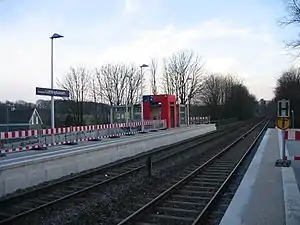 With the rebuilding of the station as a Haltepunkt (a “halt”, that is not having points) for passenger trains and the associated dismantling of platforms and trackwork, the platform next to the station building still exists but is no longer used, while the former island platform has been removed entirely. Instead two 76 cm-high external platforms were built just to the south of the former station building (and closer to the town) as a replacement of the original platforms. Both are accessed by stairs from Beyenburger Straße and by barrier-free access from Von-Boltenberg-Straße (to the western platform serving trains towards Lennep, Remscheid and Solingen) and the ramp from Grünenplatzstraße (to the eastern platform serving trains towards Oberbarmen and Wuppertal). On this platform, there is a DB Pluspunkt vending machine. Both platforms are equipped with tactile paving, single-line dynamic passenger information displays and speakers.[6]