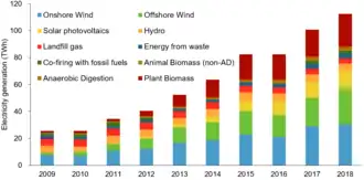 Electricity generated (TWh) from renewable sources in the United Kingdom between 2009 and 2018[1]