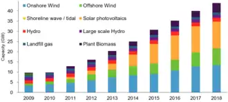 Installed capacity (GW) of renewable energy sources in the United Kingdom between 2009 and 2018[1]