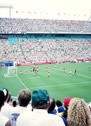 Ireland took on both Portugal and the Netherlands in 2002 World Cup qualifiers in UEFA's Group 2, ending the group in second place with 24 points from 10 matches (seven victories and three draws).[12] Despite this unbeaten run, Ireland were drawn in a play-off with Iran. The match in Dublin finished in a 2–0 victory to Ireland with goals from Ian Harte (penalty) and Robbie Keane, while the match in Tehran, played in front of 100,000 spectators, finished in a 1–0 win for Iran.[12] McCarthy thus managed to lead Ireland to the 2002 World Cup final stages, though only for the team to lose inspirational captain Roy Keane due to the pair's infamous public spat in Saipan.[28] 1–1 draws with Cameroon and Germany were followed by a 3–0 victory over Saudi Arabia in Group E.[29][30][31] The Irish once again progressed to the knockout stage, only losing narrowly 3–2 on penalties to Spain in Suwon after Robbie Keane's last minute equalising penalty kick forced the game into extra time.[32]