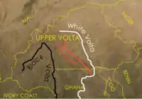 The Republic of Upper Volta (French: République de Haute-Volta) was a landlocked West African country established on 11 December 1958 as a self-governing state within the French Community.[1][2] Before becoming autonomous, it had been part of the French Union as the French Upper Volta. On 5 August 1960, it gained full independence from France.[3] On 4 August 1984, it changed its name to Burkina Faso.