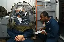 The effectiveness of various types of respirators was measured in laboratories and in the workplace.[3] These measurements showed that in practice, the effectiveness of negative pressure tight fitting respiratory protective devices (RPD) depends on leakage between mask and face, rather than the filters/canisters.[4] This decrease in efficiency due to leakage manifested on a large scale during World War I, when gas masks were used to protect against chemical weapons. Poor fit or poorly situated masks could be fatal. The Russian army began to use short-term exposure to chlorine at low concentrations to solve this problem in 1917.[5][6] Such testing helped convince the soldiers that their gas masks were reliable - because respirators were a novelty.[7] Later, industrial workers were trained in gas chambers in the USSR (in preparation for the Second World War),[8][9][10] and late[11]'. German firefighters used a similar test between the First and Second World Wars.[12] Diluted chloropicrin was used to test industrial gas masks.[13] The Soviet Army used chloropicrin in tents with a floor space of 16 square meters.[14]