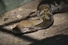 As with all pythons, the reticulated python is an ambush predator, usually waiting until prey wanders within strike range before seizing it in its coils and killing by constriction. Its natural diet includes mammals and occasionally birds. Small specimens up to 3–4 m (9 ft 10 in – 13 ft 1 in) long eat mainly small mammals such as rats, other rodents, mouse-eared bats, and treeshrews, whereas larger individuals switch to prey such as small Indian civet and binturong, primates, pigs, and deer weighing more than 60 kg (132 lb 4 oz).[42] As a rule, the reticulated python seems able to swallow prey up to one-quarter its own length and up to its own weight. Near human habitation, it is known to snatch stray chickens, cats, and dogs on occasion.[26] Among the largest documented prey items are a half-starved sun bear of 23 kg (50 lb 11 oz) that was eaten by a 6.95 m (22 ft 10 in) specimen and took some 10 weeks to digest.[28] At least one case is reported of a foraging python entering a forest hut and taking a child.[43]