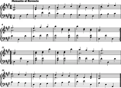 - Joseph Haydn, Symphony No. 47, 3rd movement, "Minuetto al Roverso"