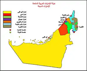 After independence in 1971, the Trucial States became known as the United Arab Emirates. The first revenues were issued in around 1973 and they showed a dhow, a palm tree, an oil rig and camels, and a map and symbols of the newly independent country. In 1975 a new design portraying the coat of arms was issued, and all later stamps were in this design. From 1988 onwards, stamps in this design but a different inscription below the coat of arms were also issued to pay the medical fee as well.[1][3]
