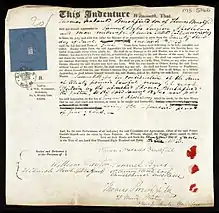 In the case of thick parchment such as vellum which did not allow for embossing directly on it, a paper was attached to the document using glue and a strip of tin, and the embossing was applied to this paper. A number of different coloured papers were used, including red, green, vermilion and most commonly blue. The ends of the strip of tin at the back of the document were covered with a small paper seal which bore the royal cypher of the reigning monarch. These were first introduced in 1701 under King William III, and continued to be used until 1921.[1]