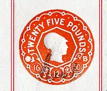 The first revenue stamps used in the United Kingdom were impressed duty stamps issued by the Kingdom of England following the introduction of Stamp Duty in the Stamps Act 1694.[1] This was An act for granting to Their Majesties several duties on Vellum, Parchment and Paper for 10 years, towards carrying on the war against France (5 & 6 Will. & Mar. c. 21).[2] The duty ranged from 1 penny to several shillings on a number of different legal documents including insurance policies and documents used as evidence in courts. It raised around £50,000 a year[3] and although it was initially a temporary measure, it proved so successful that its use was continued. Successive Acts have created new duties and impressed duty stamps are still in use to collect taxes, although electronic methods are now taking over. Around 10,000 different dies of impressed duty stamps have been used since the 17th century, and these exist with face values of up to £1 million.[1]